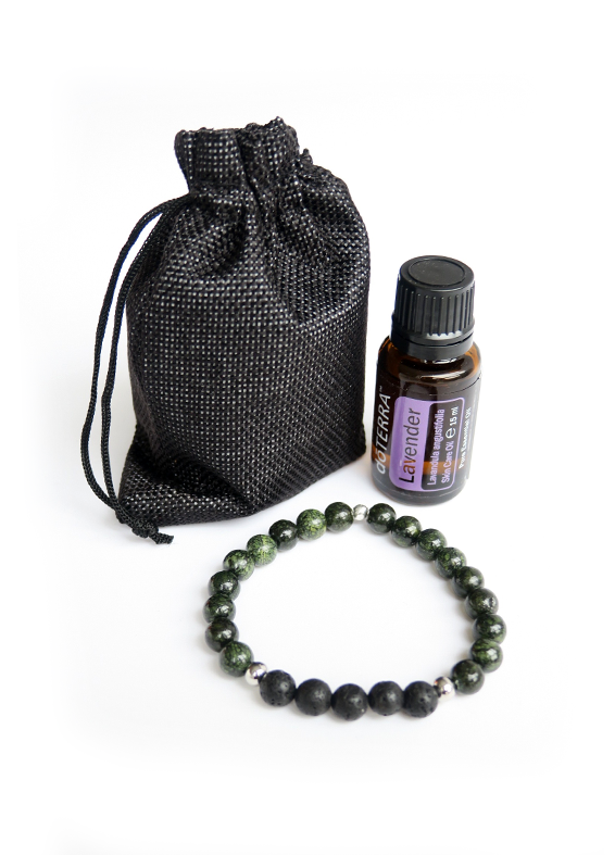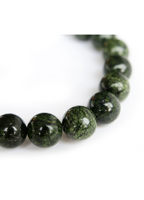Deze geurarmband is gemaakt van Russisch Serpentijn. Serpentijn is een zeer harde natuursteen met een vulkanische oorsprong en behoort tot de hoogst gewaardeerde stenen om zijn zeer mooie uiterlijk. De tint van de steen laat zien uit welke aardlaag de steen is gewonnen. Hoe donkerder de kleur, hoe dieper de steen is gedolven.
