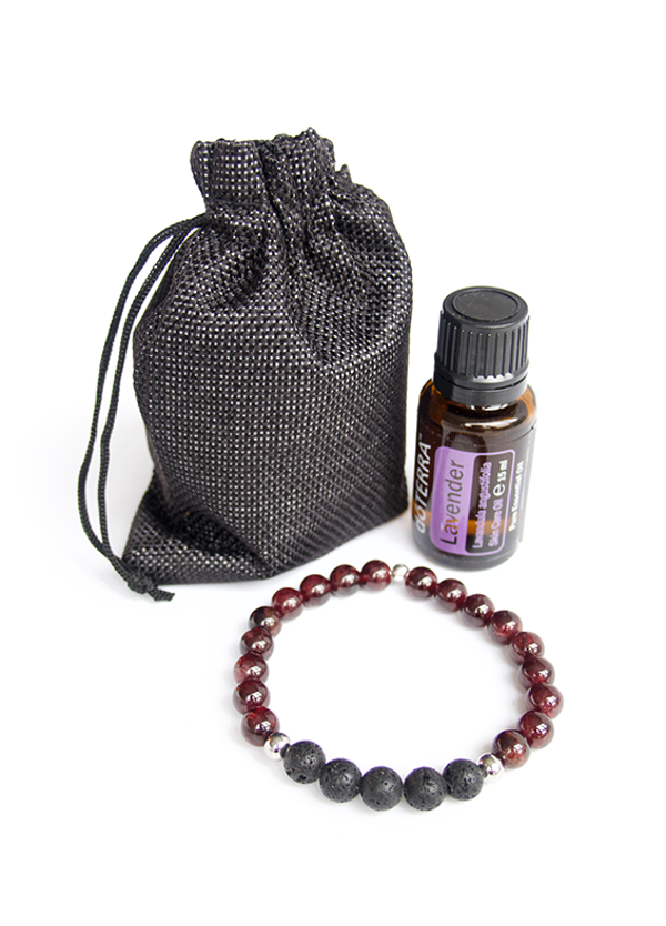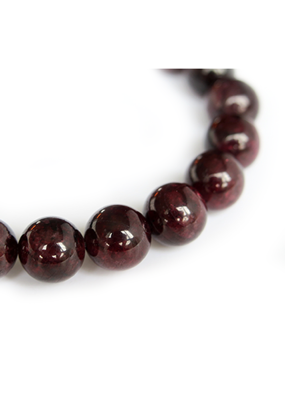 Deze geurarmband is gemaakt van Rode Granaat. De granaat is een van de hardste edelstenen. Granaten worden diep in de aarde gevormd, in de binnenste aardmantel of de overgang naar de buitenste aardmantel. Granaten zijn vaak bestanddeel van dieptegesteentes. De Rode granaat is heel diep van kleur en verraadt zijn genuanceerde rode gloed alleen bij voldoende licht. Een elegante en stijlvolle armband.